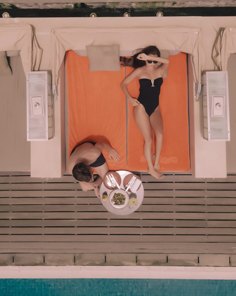 Sundara Beach Club is built around a long pool that runs along the edge of Jimbaran Bay. Large daybeds and sun decks line the water, giving you space to relax,