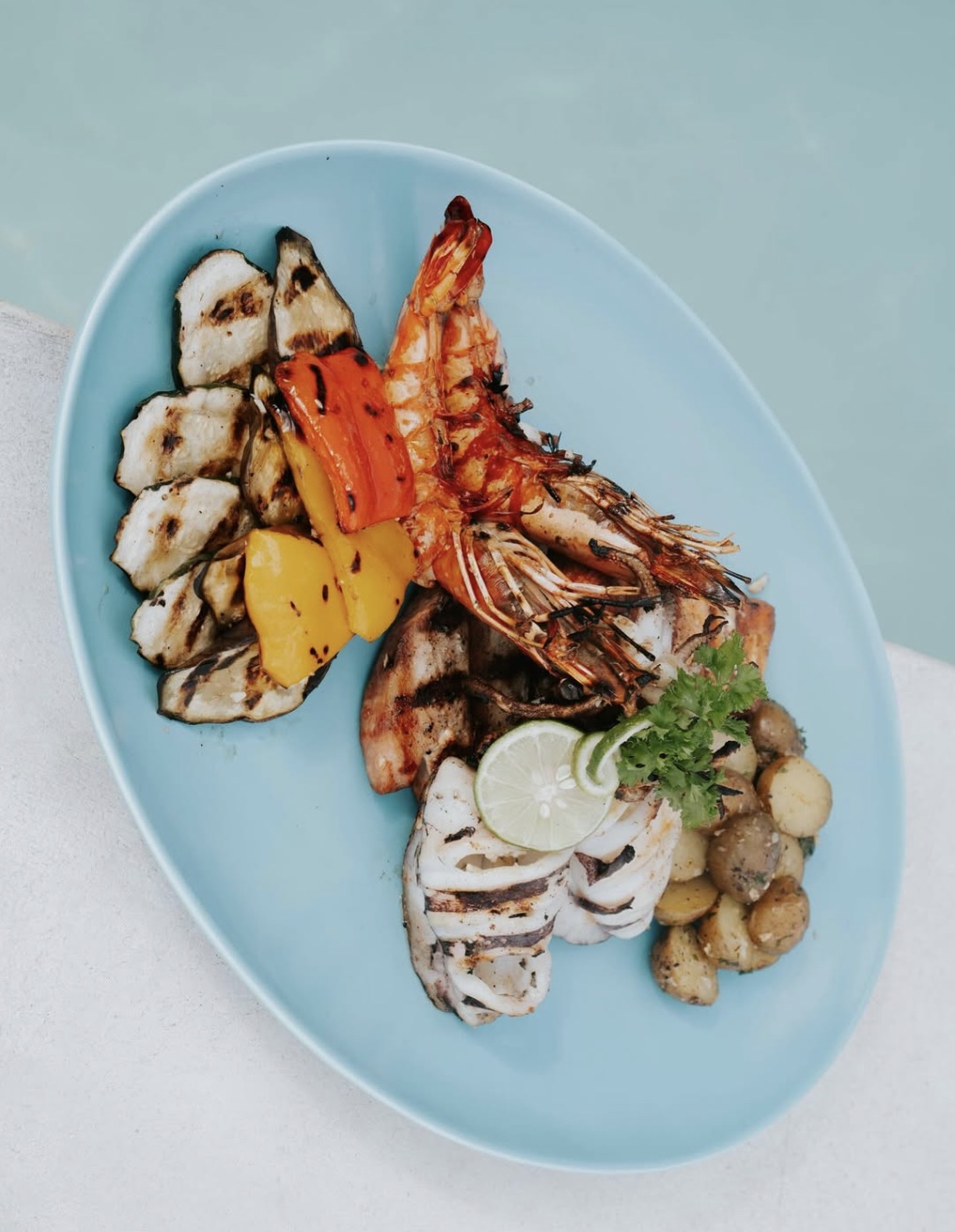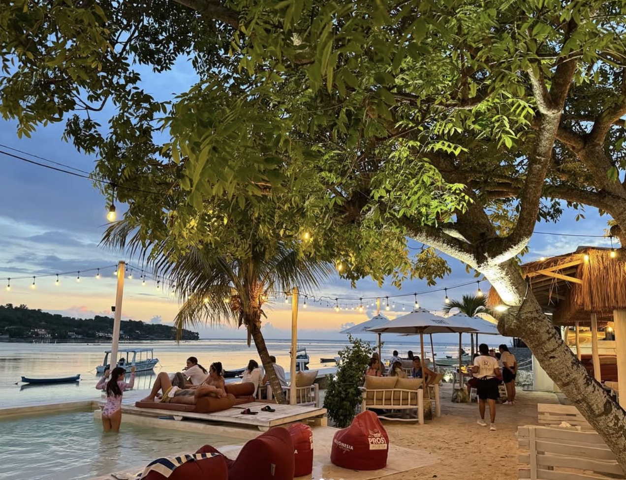 The pizza oven is always going, turning out thin, crispy bases with simple, satisfying toppings, while the garlic prawns (a house favourite) are rich, buttery, and made for sharing. You’ll also find a small pool, plenty of deck space, and views across the seaweed farms and colourful boats drifting between the islands — making it an easy go-to for lunch or sunset snacks.