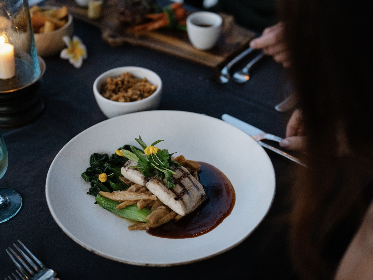 Dinner here feels special — often served poolside under the stars, with views stretching out to the coastline and the soft glow of firelight nearby. The menu shifts with the catch of the day, so the grilled fish on your plate might have been swimming just a few hours earlier.
