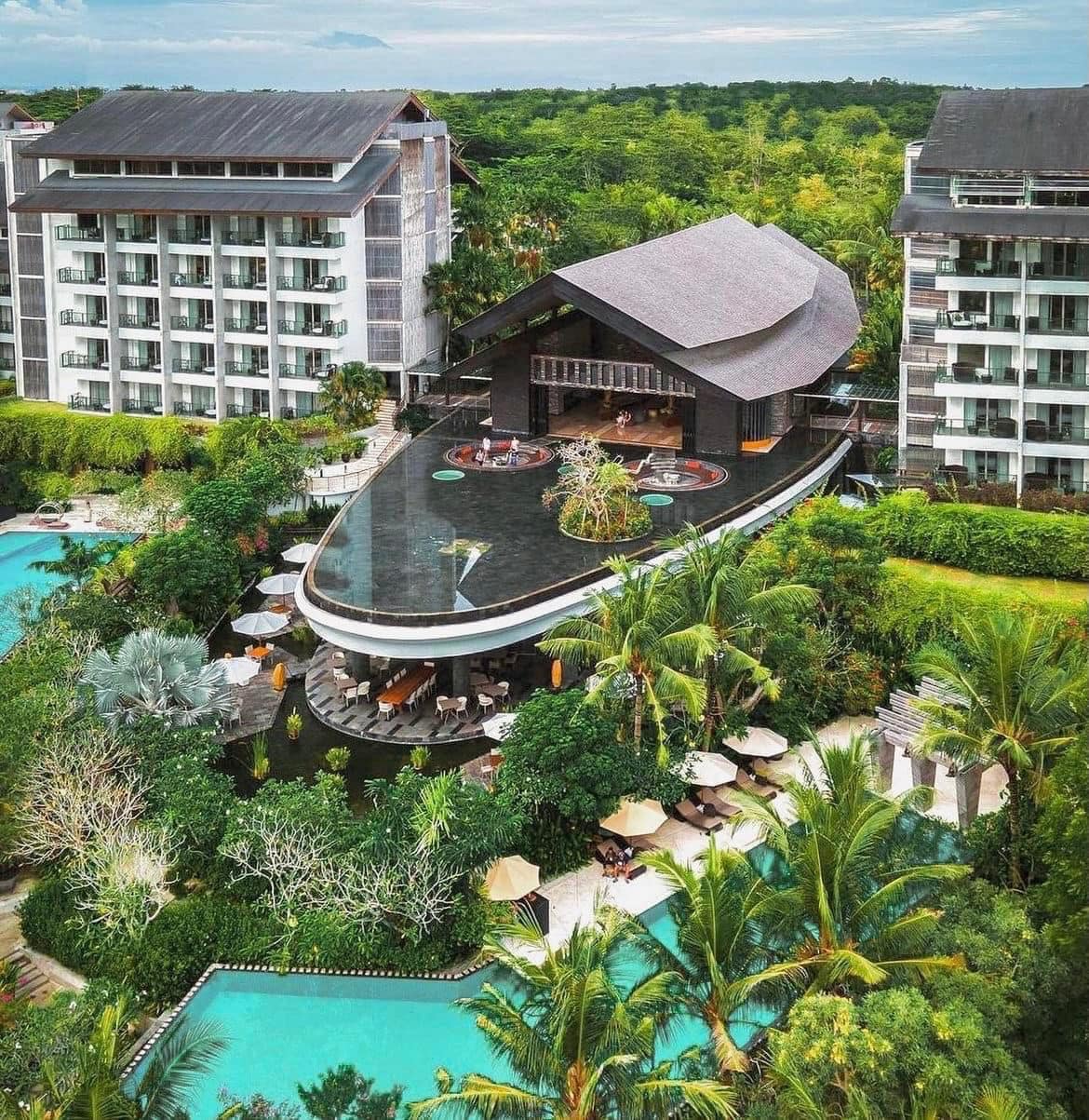 Rooms are contemporary and light, overlooking treetops or pools. The resort is layered with terraces, long paths, and quiet corners that feel peaceful even when busy. UNIQUE Rooftop Bar and Restaurant is a highlight for sunset, while breakfast at To’Ge feels relaxed and generous.