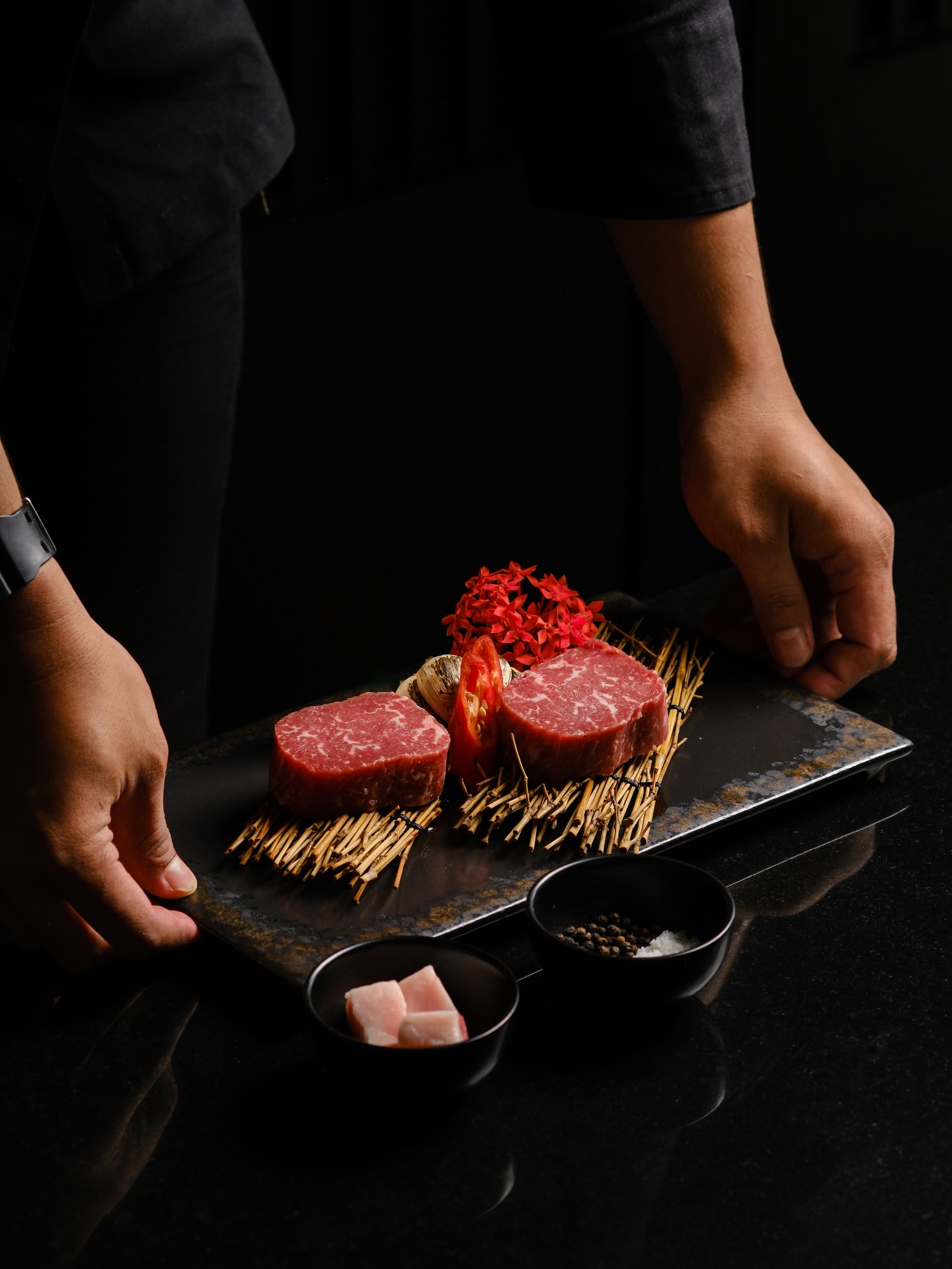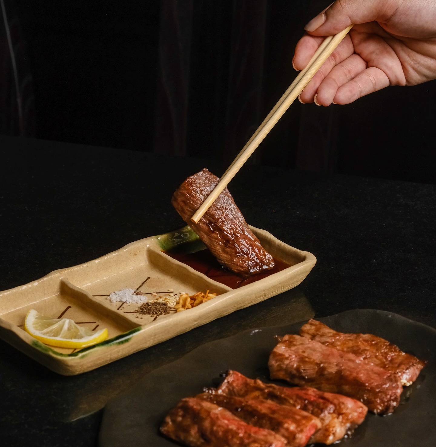 At the heart of the experience is the use of Japanese white charcoal, known as bincho tan, which is used to grill each dish at your table. This style of cooking locks in flavour and adds a soft smoky depth to every bite. The kitchen is led by Executive Chef Takumi Kimura, whose background in Japanese hotels shapes the careful way each plate is prepared, from the meats to the rice that comes with them.