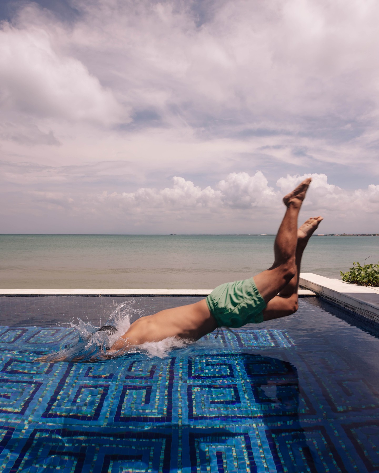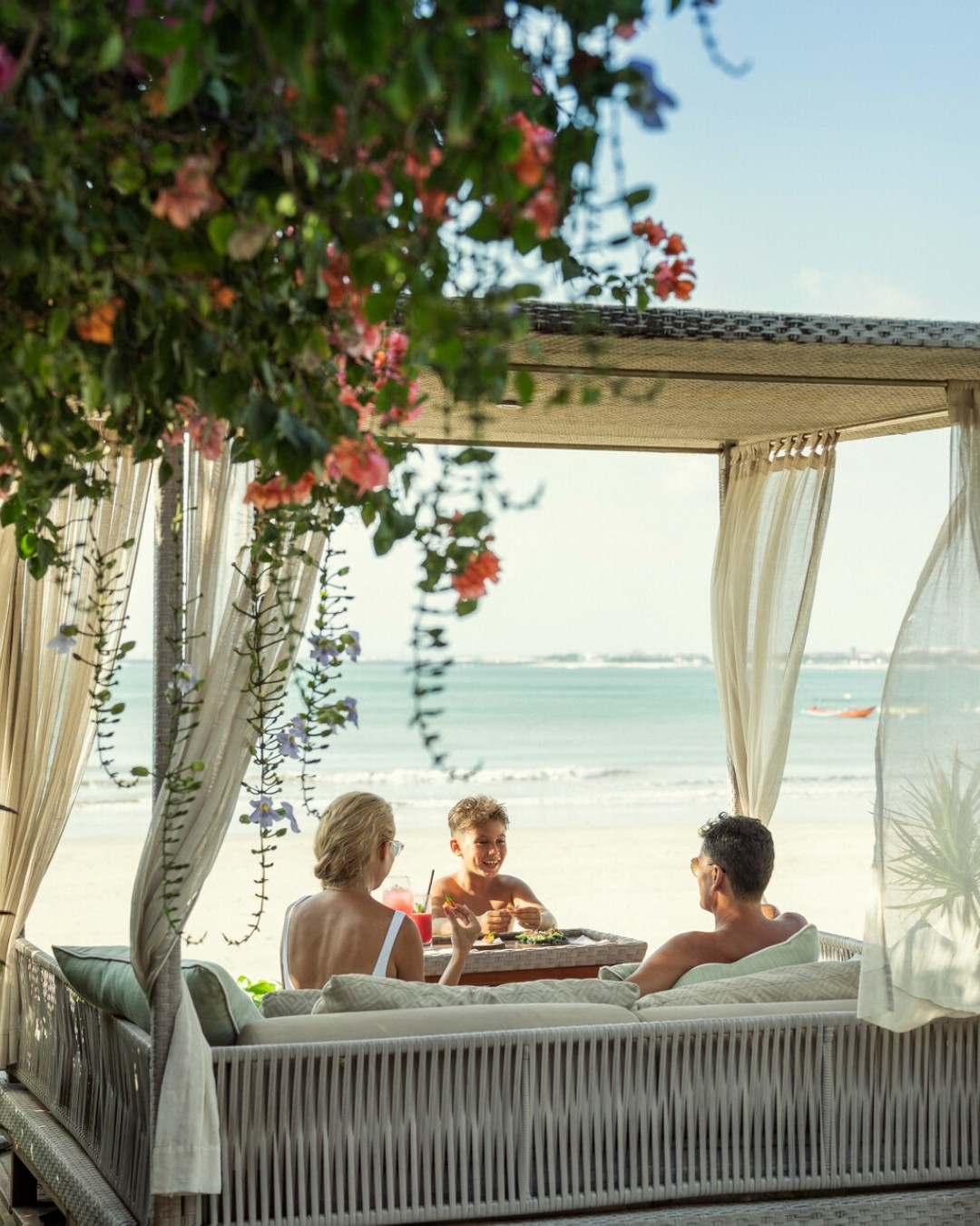 Sundara Beach Club is built around a long pool that runs along the edge of Jimbaran Bay. Large daybeds and sun decks line the water, giving you space to relax, swim and enjoy the view from morning until evening.