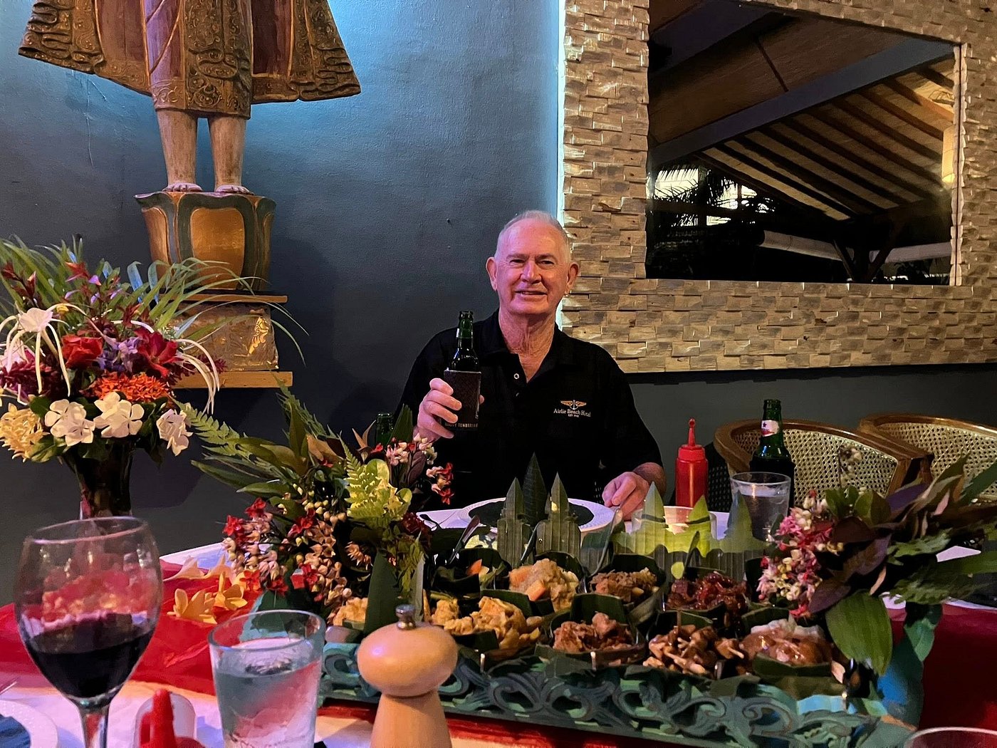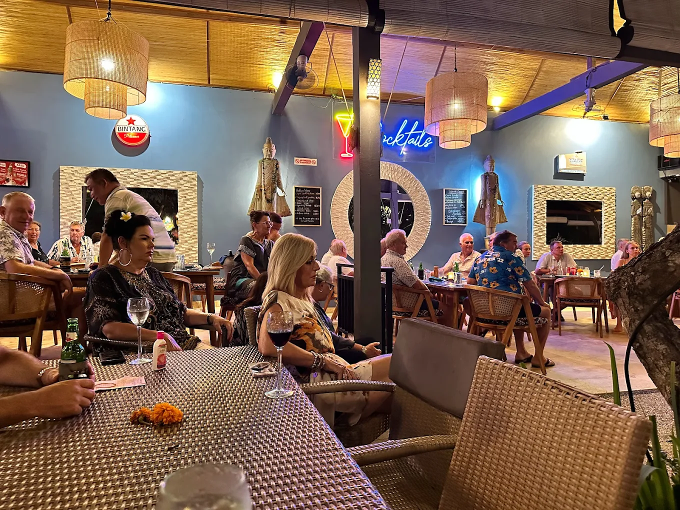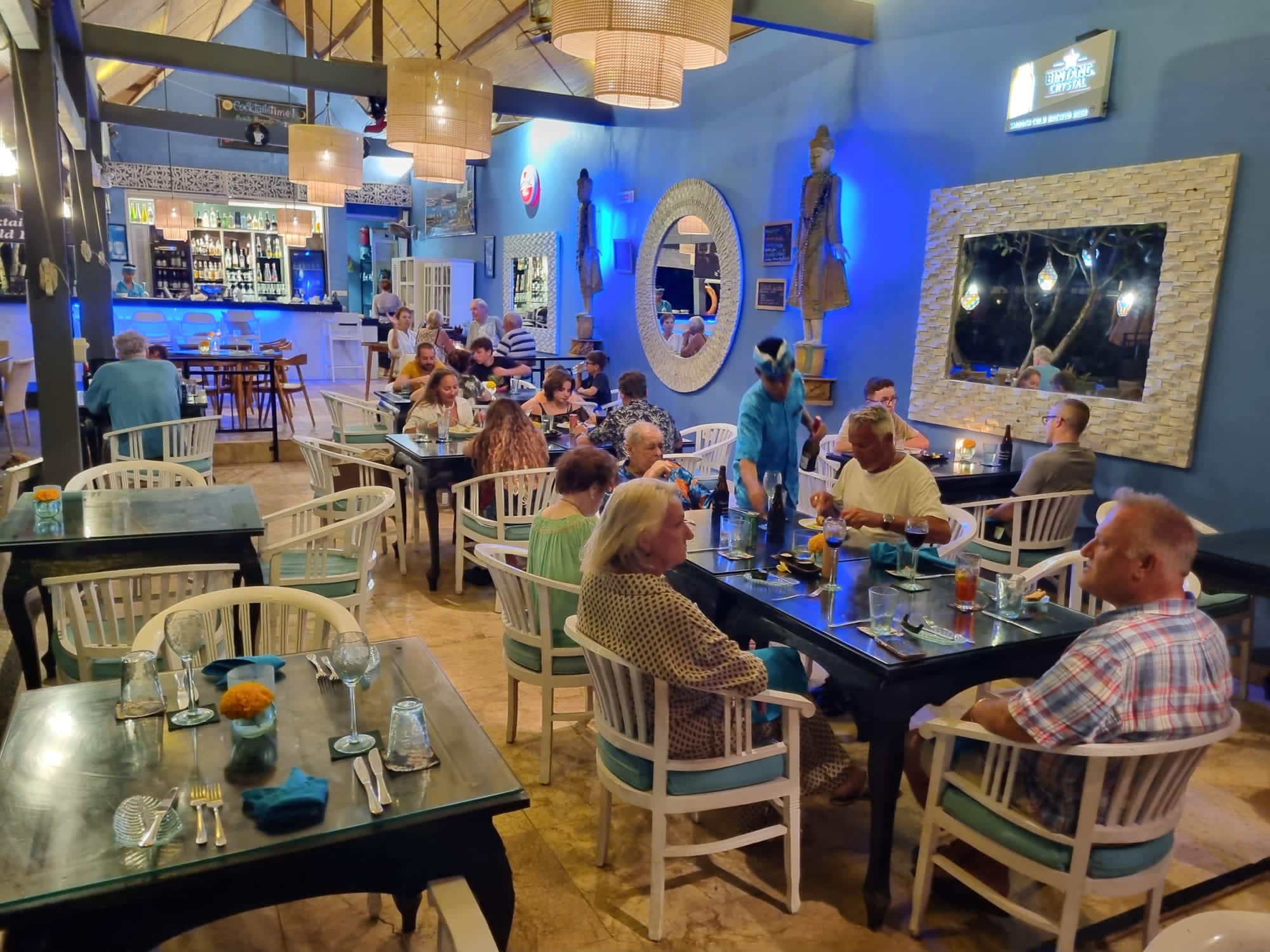 The menu is broad without feeling overwhelming. Owned by a former Australian chef, the kitchen turns out polished plates like duck à l’orange, generous satay platters, fresh seafood, crisp salads, and simple Western classics done well. It works equally well for a casual wine-filled afternoon or a moonlit dinner with the sound of the waves in the background.
