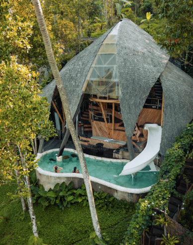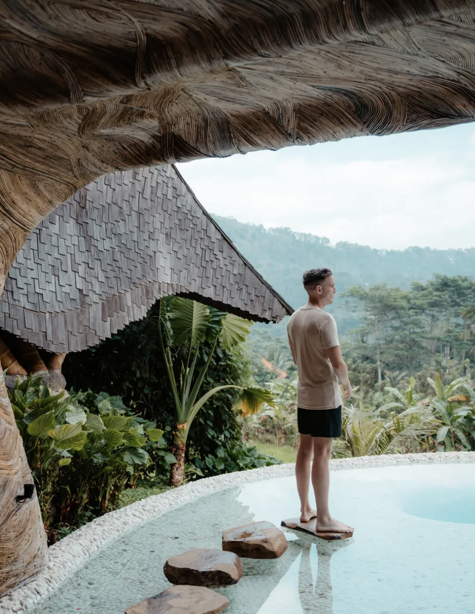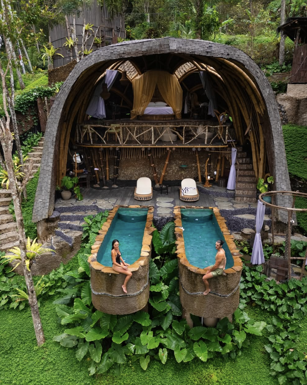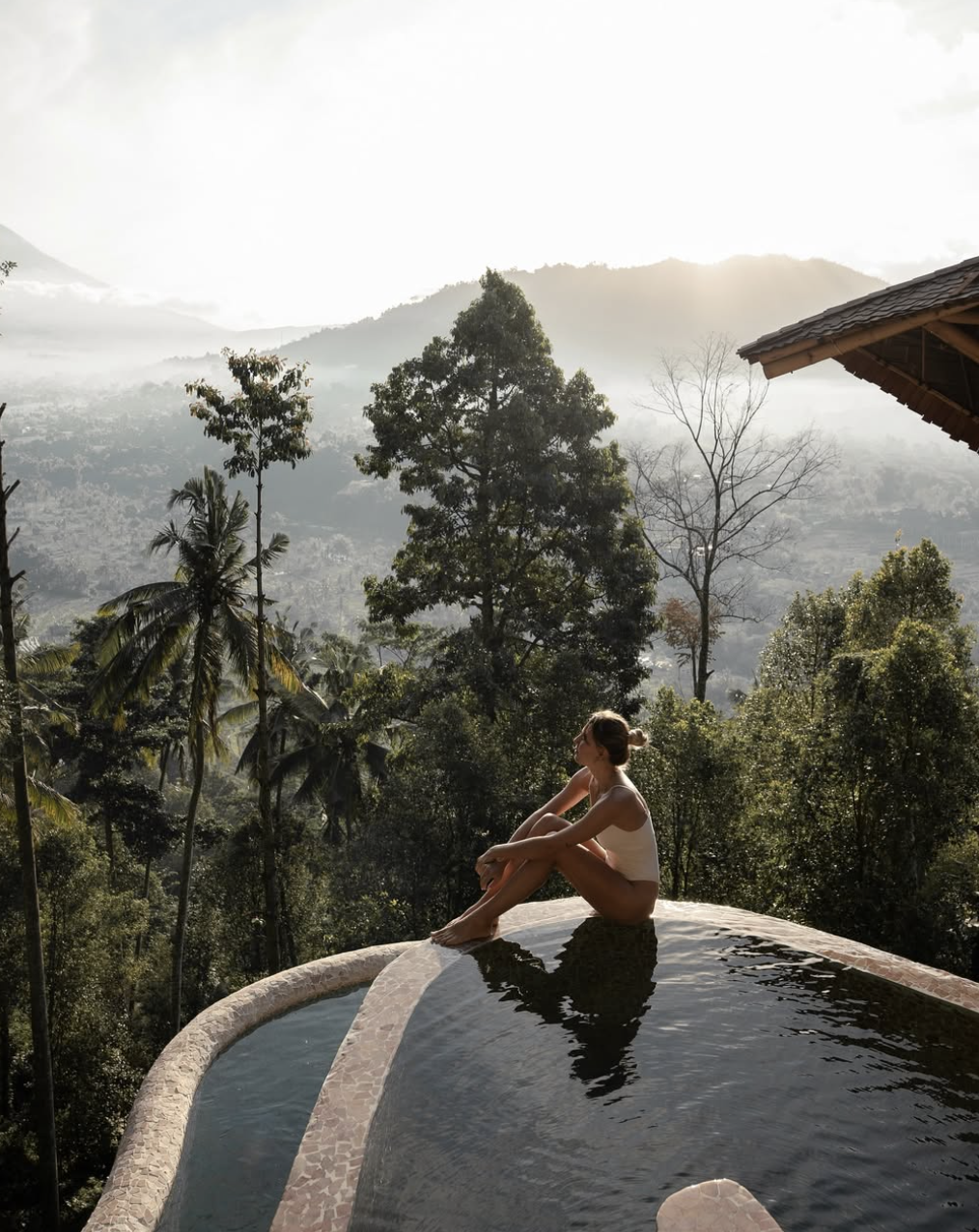 Each villa is shaped from handcrafted bamboo, designed with sustainability in mind and built to sit gently within the landscape. Interiors feel warm and organic, while the outdoor spaces open to sweeping views of Mount Agung. Most villas come with a private pool that blends into the terrain, giving the sense that it’s part of the valley itself.
